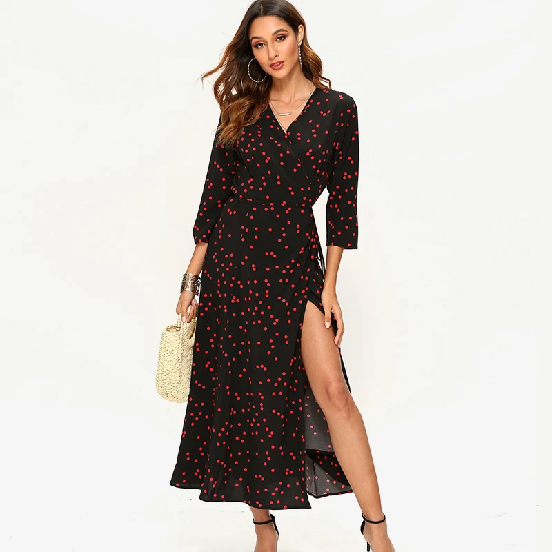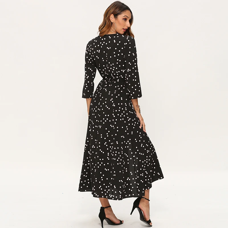 Special Offer Mujeres Polka Dot vestido largo Boho Sexy cuello en V partido Maxi vestido elegante de tres cuartos de manga Casual vendaje vestidos Discount 49% Today!