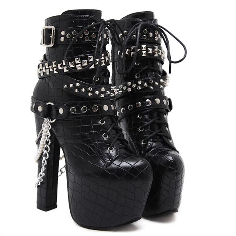 Special Offer Botas de piel otoño moda tacones altos Botines mujer tachonado tacones botas de invierno con plataforma zapatos tacones gruesos punk botas LJA95 Discount 18% Today!