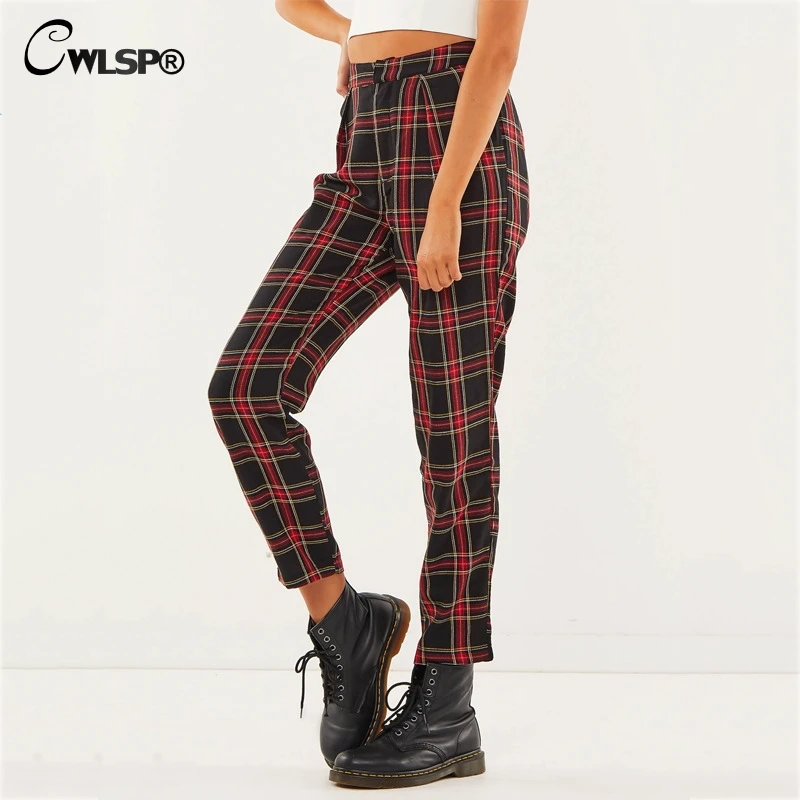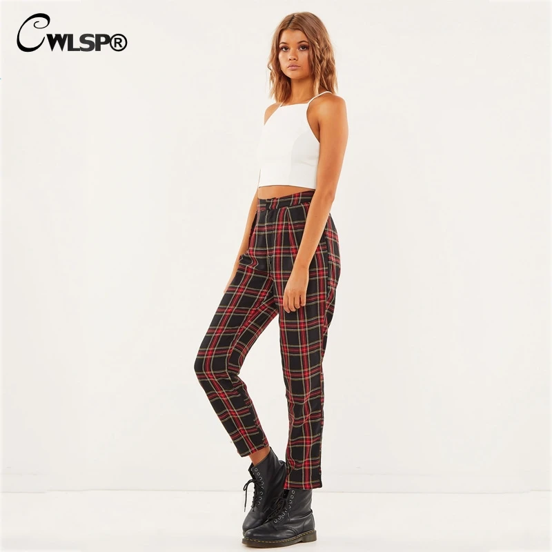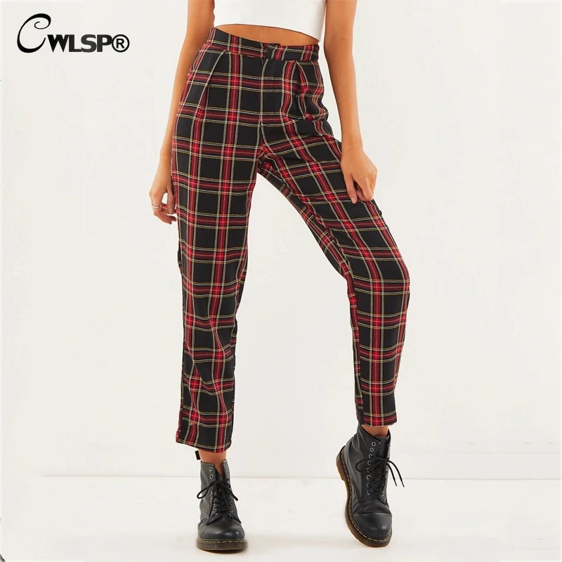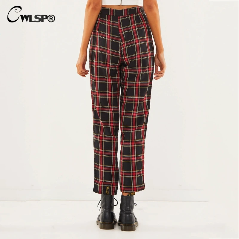 Special Offer CWLSP otoño algodón recto tobillo longitud pantalones con cremallera Casual suelta Plaid medio cintura Pantalones mujer pantalon mujer QL4173 Discount 40% Today!