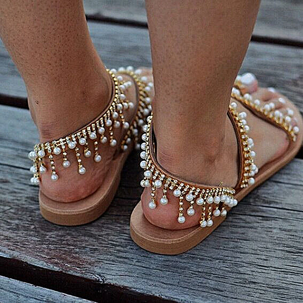 Special Offer Mujeres sandalias de verano planas sandalias de perlas chanclas Roma zapatos cadena cuentas de zapatillas mujer gladiador sandalias zafiro femeninos Discount 48% Today!