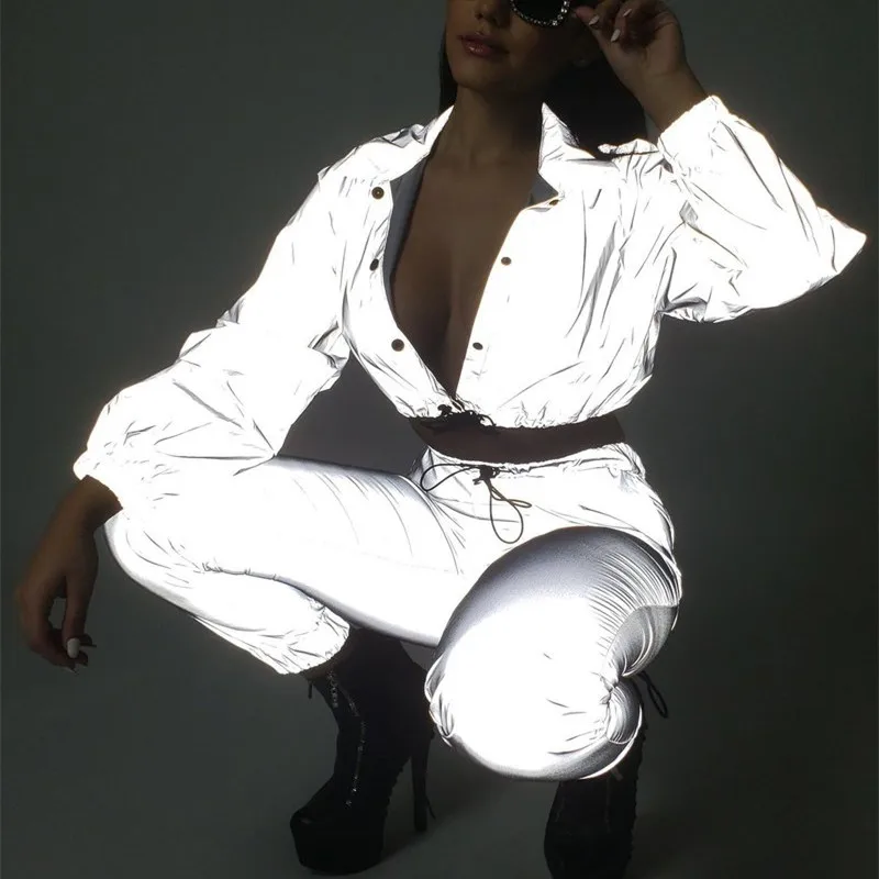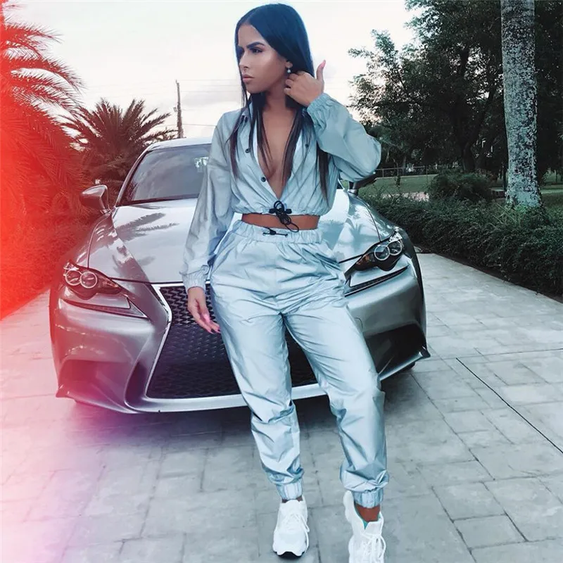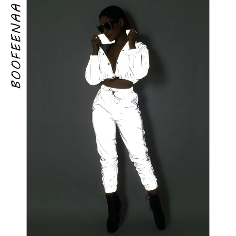 Special Offer BOOFEENAA reflectante conjunto de dos piezas con cordón Crop superior y pantalones Hip Hop Club Festival traje chándal Joggers traje C0 AI23 Discount 50% Today!