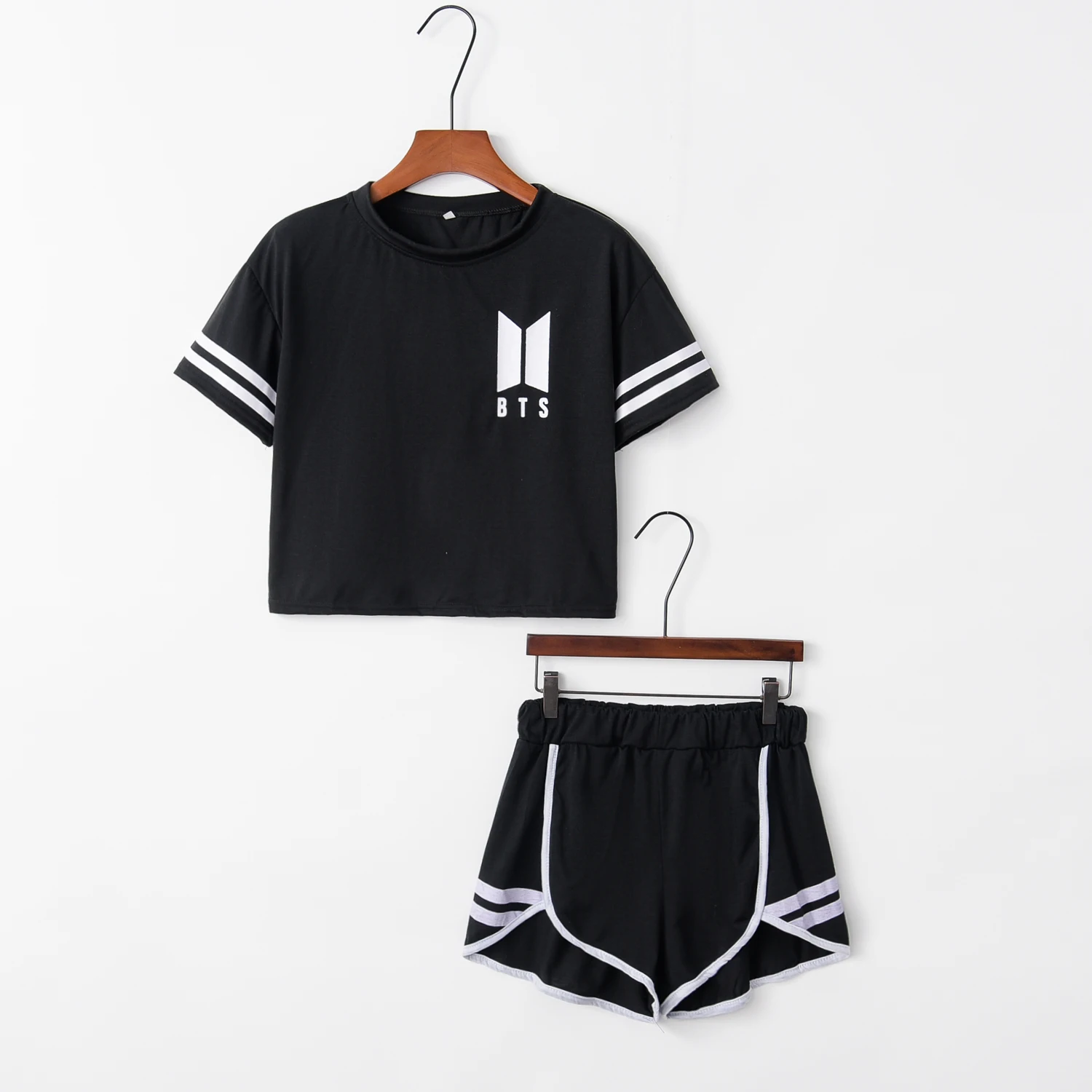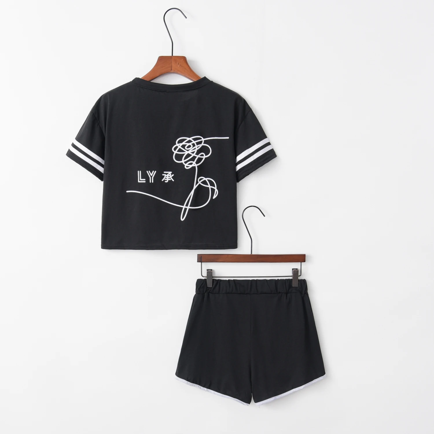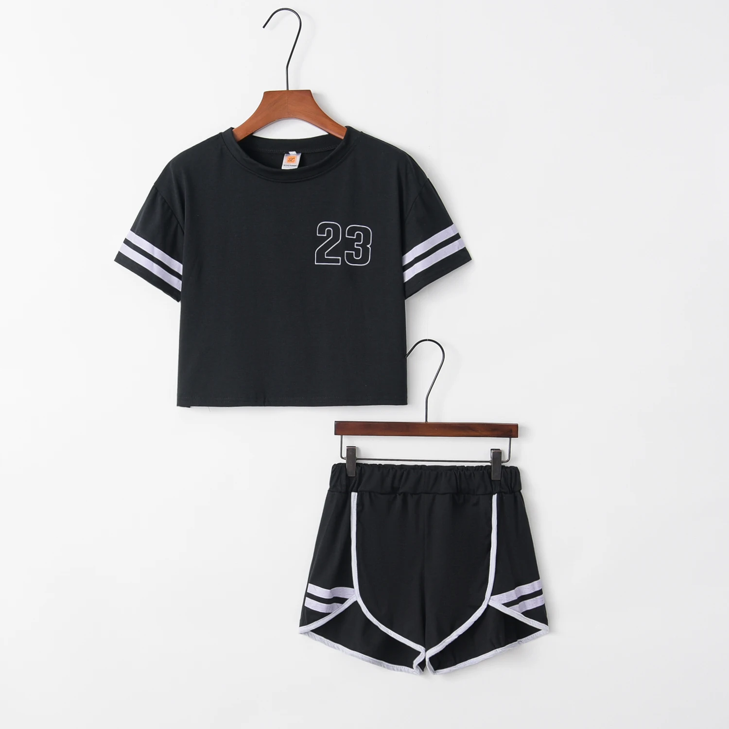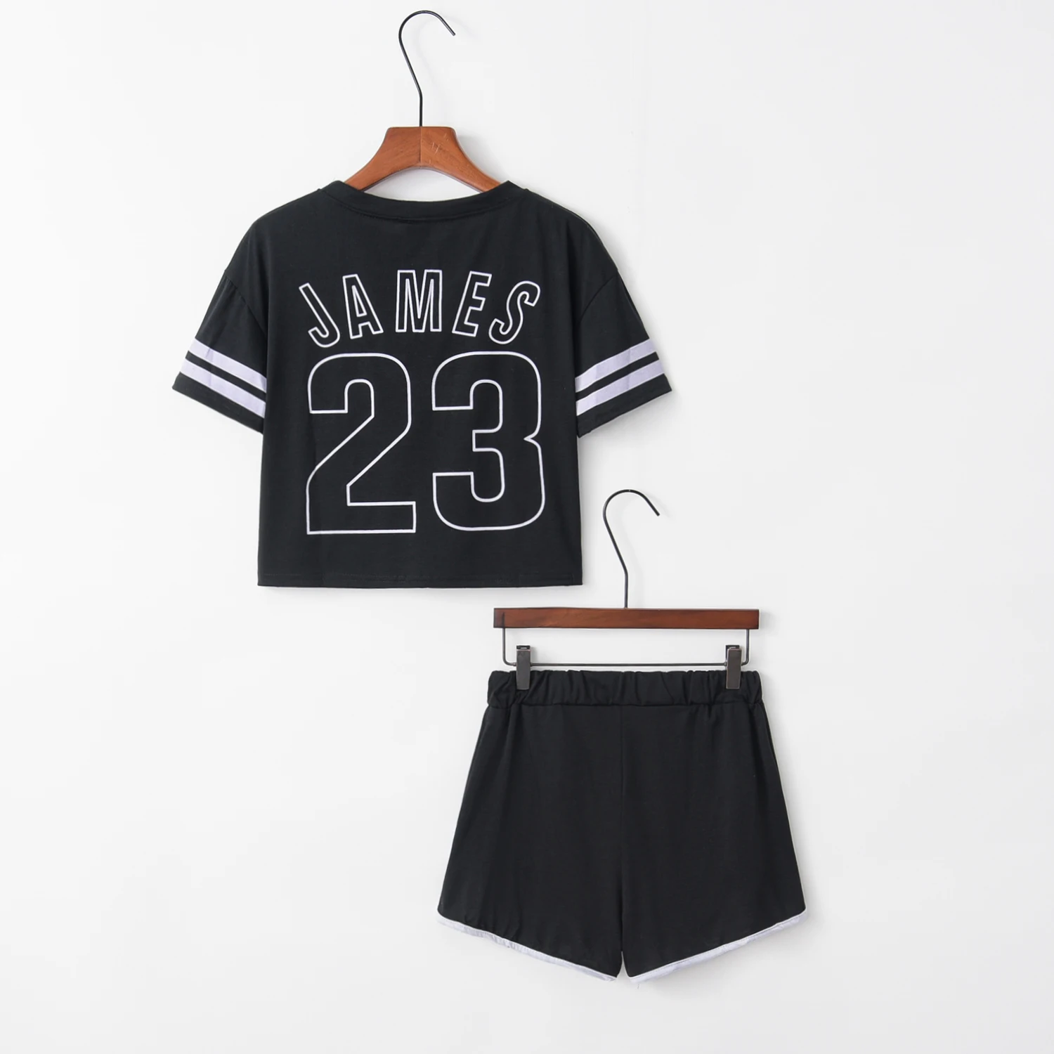 Special Offer Chándal de moda para mujer Pantalones cortos de algodón y Crop Top Set de cuello redondo de manga corta a rayas Negro Love You mismo traje y 23 james Discount 0% Today!