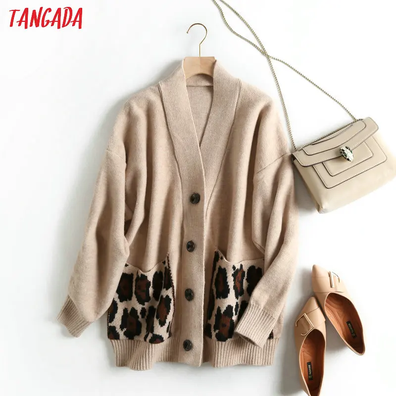 Special Offer Tangada mujer otoño cárdigan de gran tamaño cuello en v leopardo sudadera con bolsillos manga larga superior 2019 lady knitted cardigan coat BC15 Discount 30% Today!