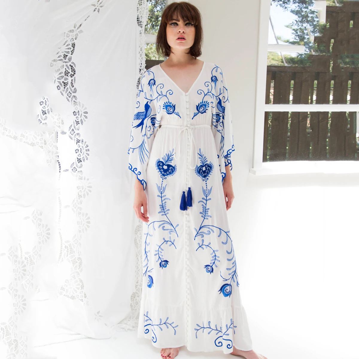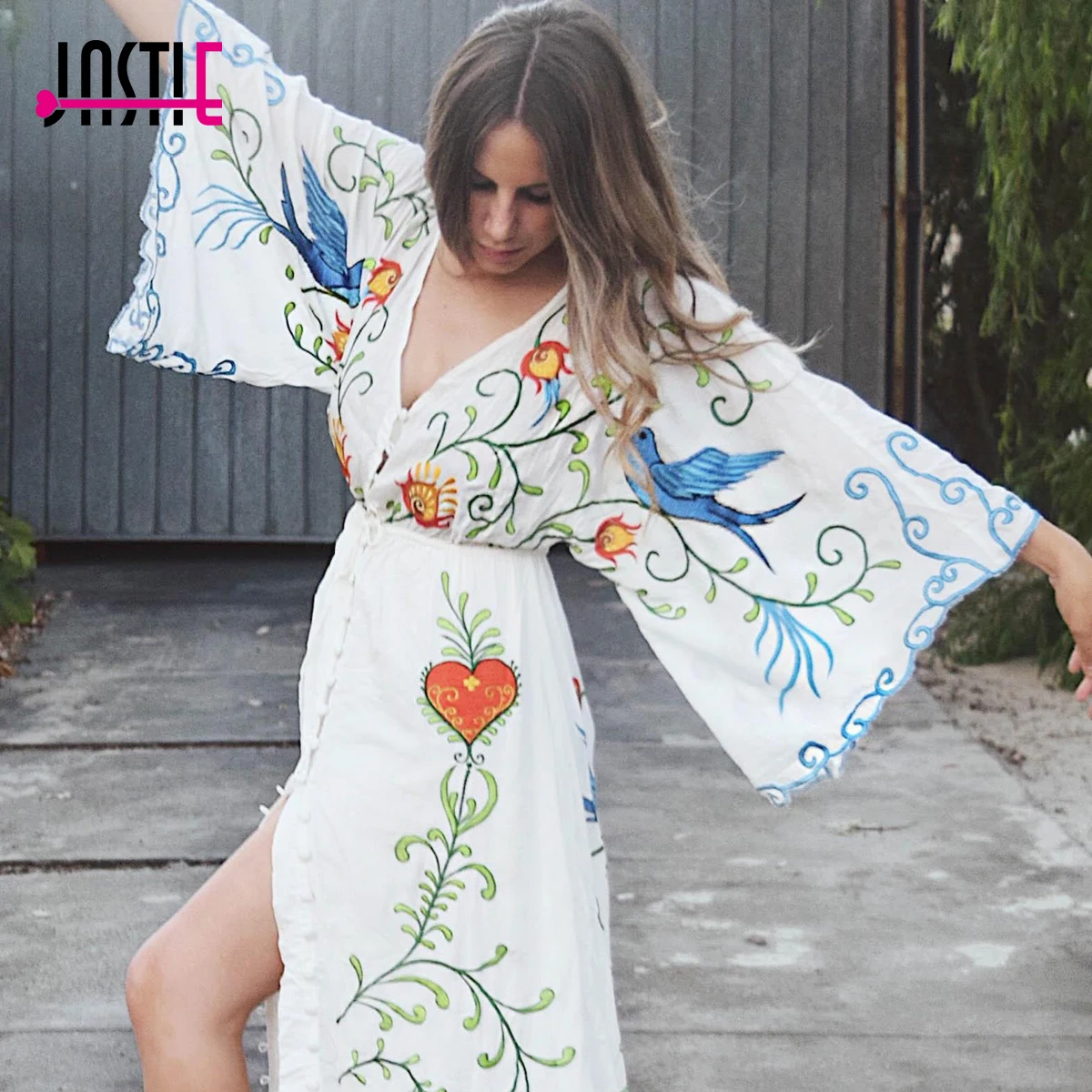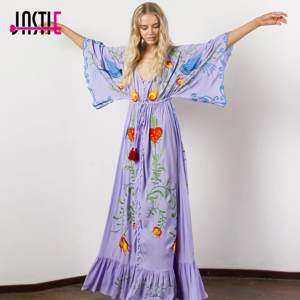 Special Offer Jastie bordado mujeres Maxi vestido con cuello en V manga de murciélago suelta de talla grande vestidos de verano con cordón cintura vestidos playa Boho Discount 31% Today!
