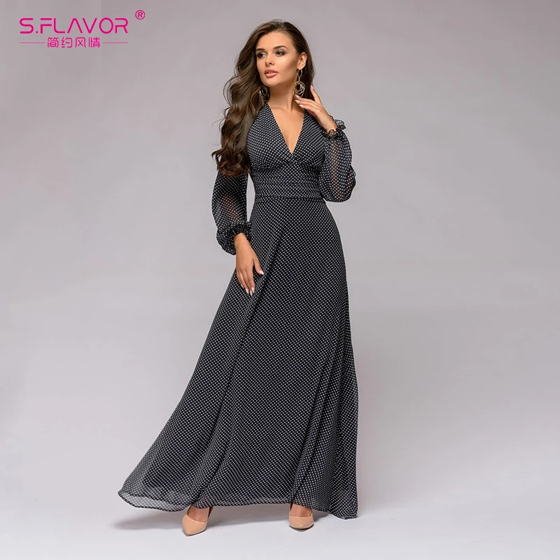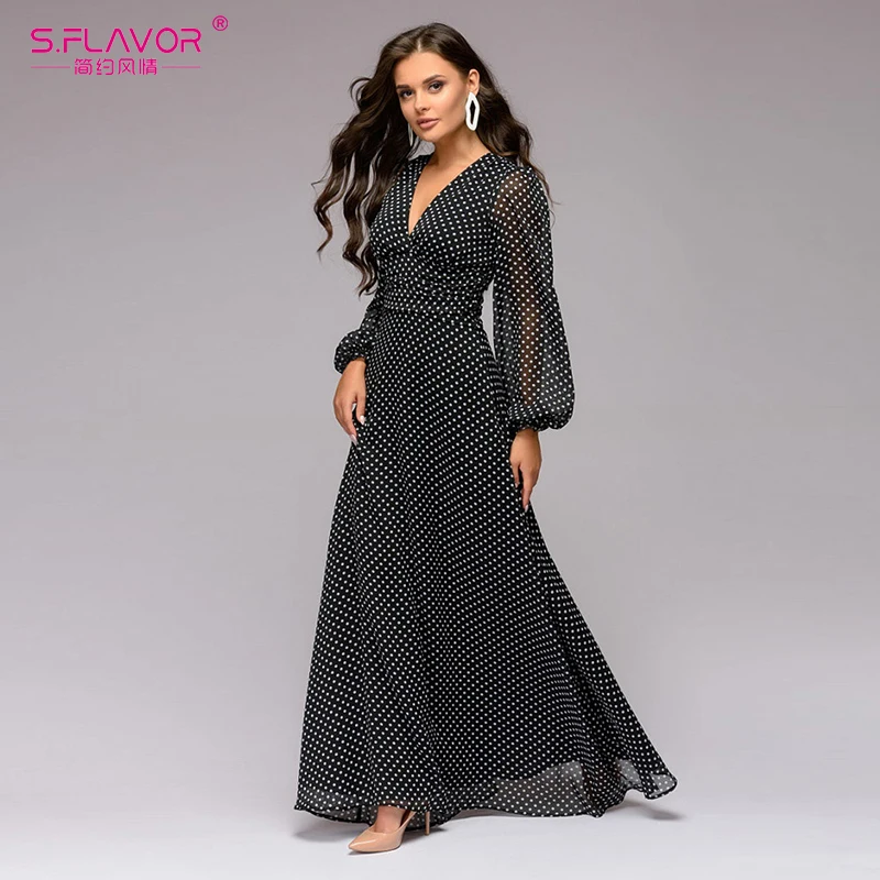 Special Offer S.FLAVOR bohemio Retro Dot impreso mujeres vestido Otoño Invierno profundo cuello pico Sexy manga larga De gasa Vestidos De Discount 46% Today!
