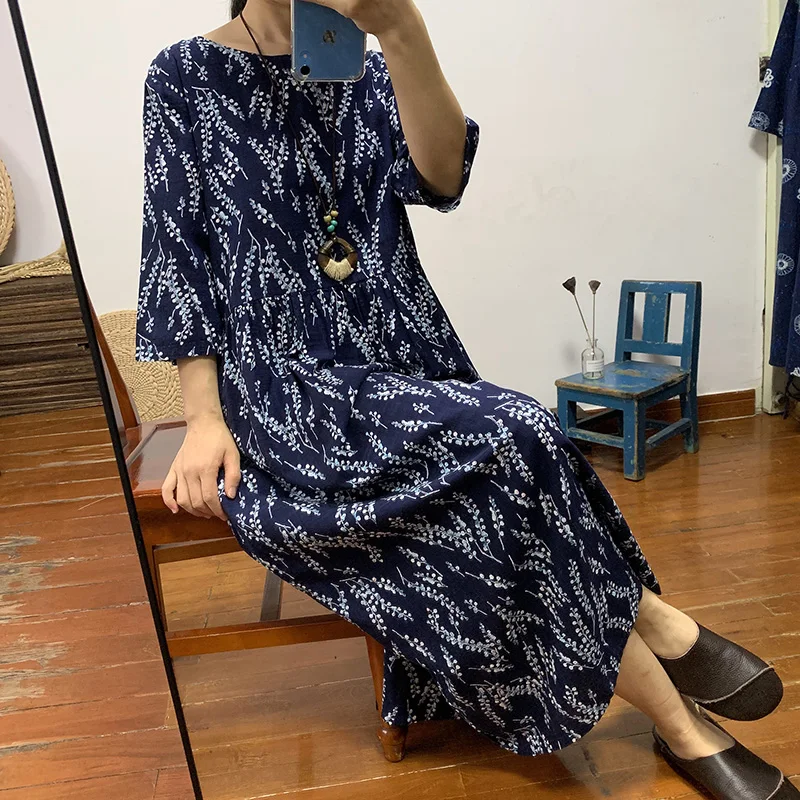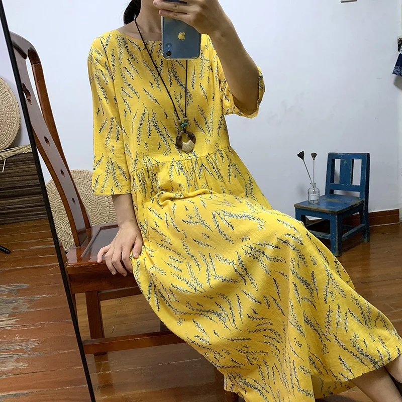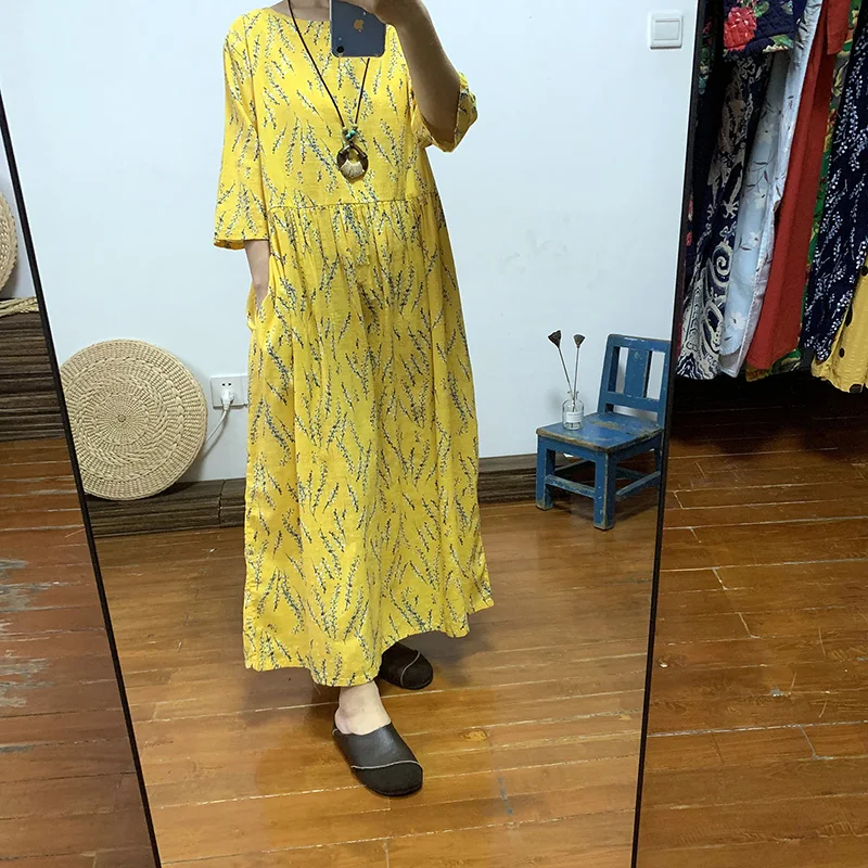 Special Offer Verano fino floral algodón vestido de algodón suelto y cómodo media manga cintura largo tobillo longitud vestido Discount 0% Today!