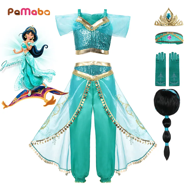 Special Offer Traje de fiesta de princesa Jasmine para niñas, ropa de fantasía, pantalones de diadema para niños, Aladino y la lámpara mágica Discount 30% Today!