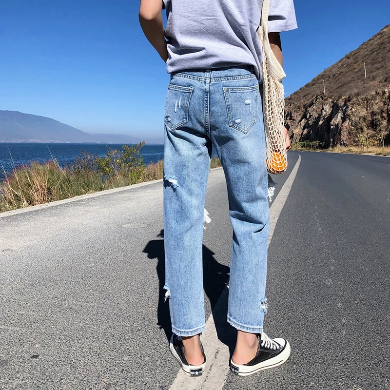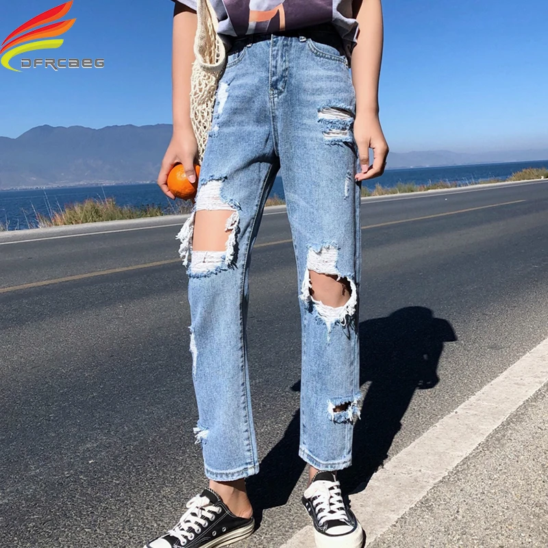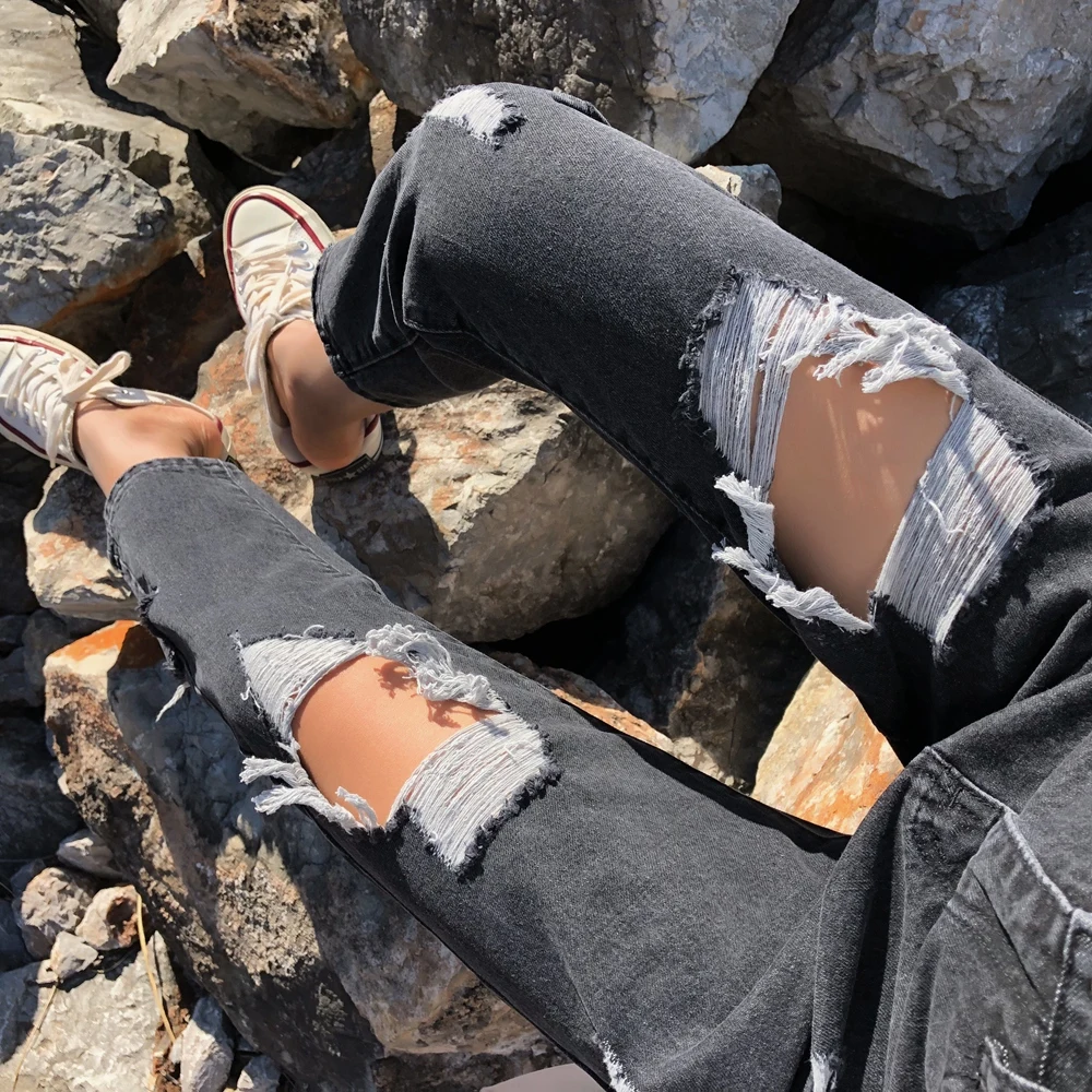 Special Offer Cool Hole Jeans Mujer 2019 Primavera Verano nuevos vaqueros largos mujeres Streetwear alta cintura recta Negro Azul pantalones de mezclilla para las mujeres Discount 14% Today!