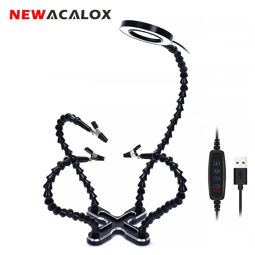 Special Offer Newacarax USB LED 3X gafas lámpara de lupa DIY soldadura de tercera mano 4 piezas brazos flexibles de soldadura ayuda soporte herramienta de reparación Discount 50% Today!