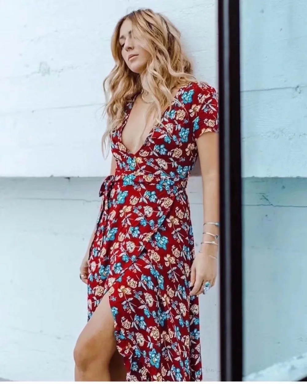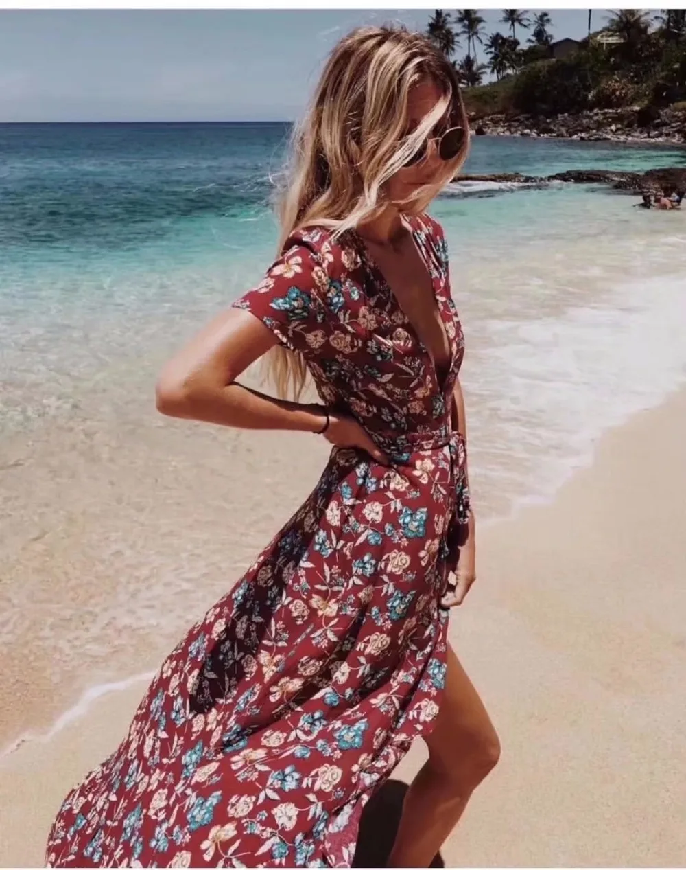 Special Offer Vestido de playa boho de verano para mujer sexy cuello en V corte Irregular estampado floral largo Maxi vestidos de talla grande Discount 0% Today!