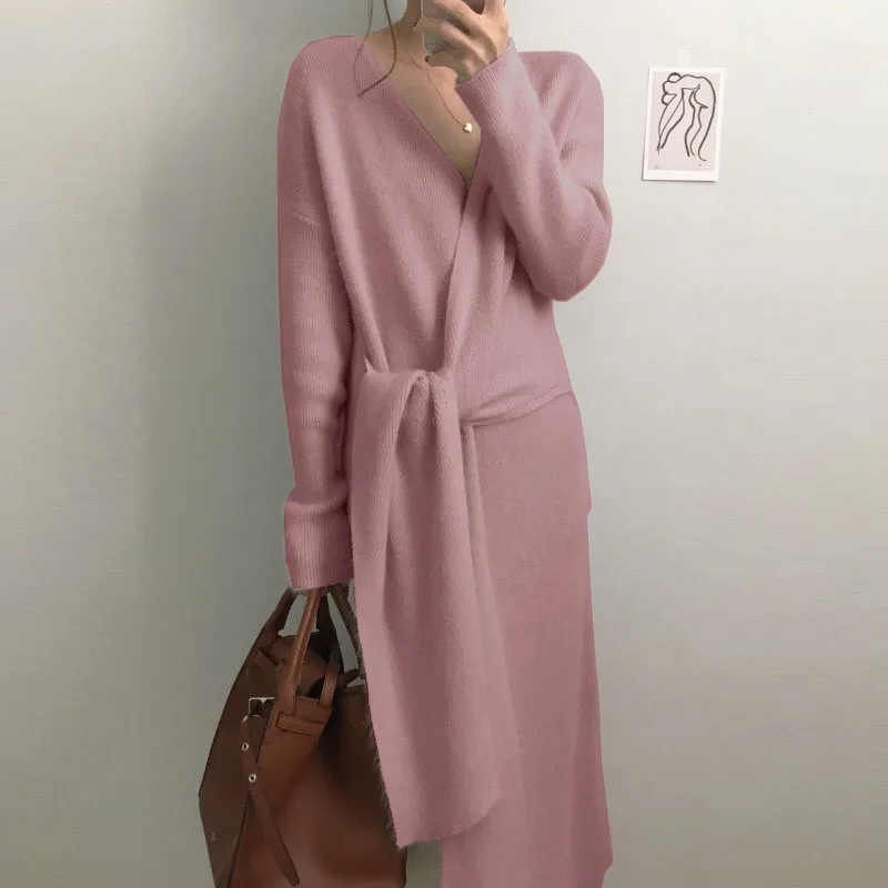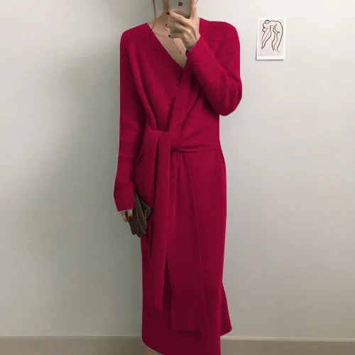 Special Offer RUGOD nuevo suéter coreano con cinturón largo Vestido de mujer sólido Casual suave cálido Vestido de Cachemira elegante Vestido de manga larga con cuello en V para mujer Discount 44% Today!
