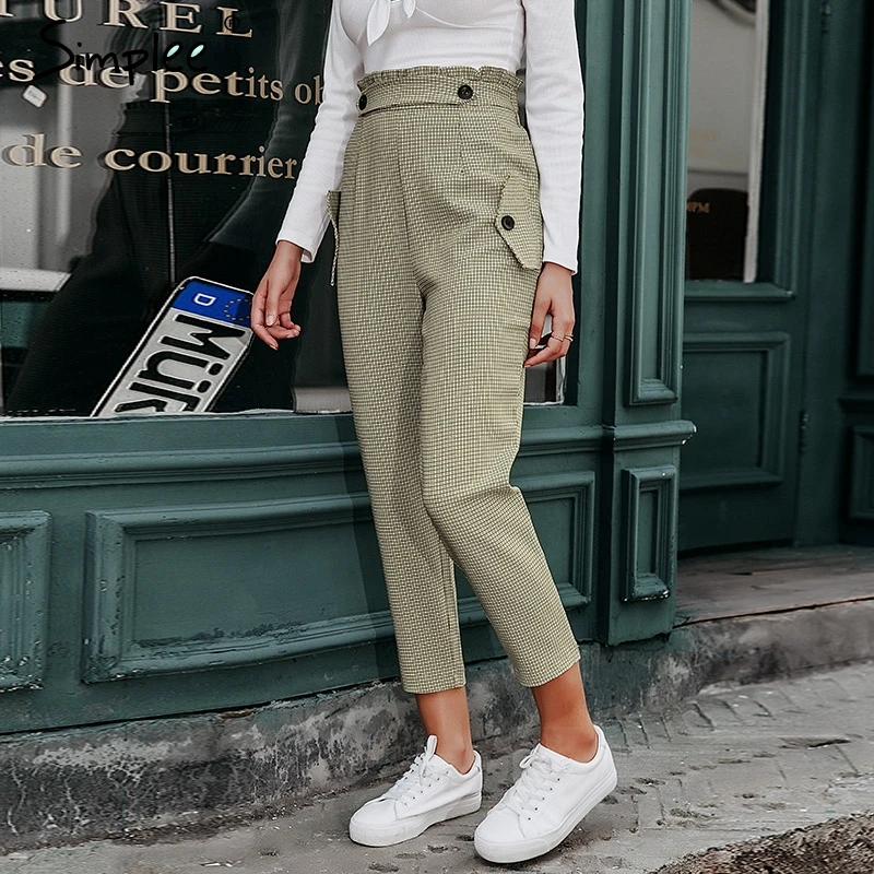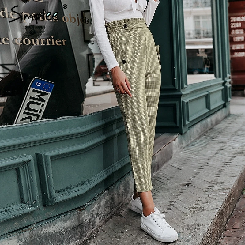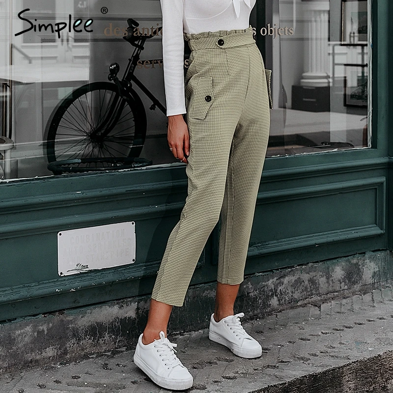 Special Offer Simplee Plaid trabajo pantalones mujeres volantes cintura alta cremallera pantalones capris harén mujer Vintage botón señoras otoño pantalones 2019 Discount 44% Today!