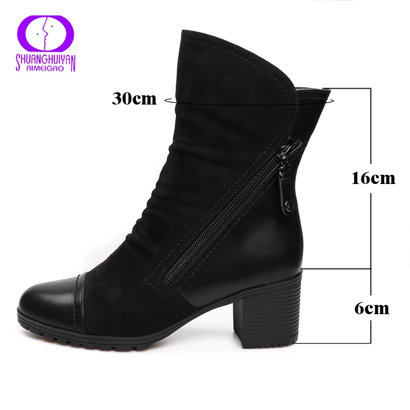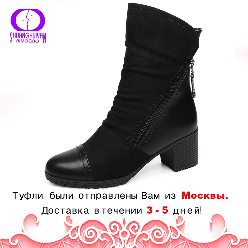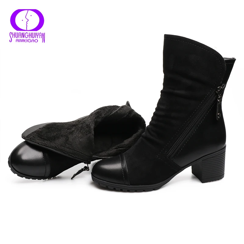 Special Offer AIMEIGAO Nueva Llegada de Las Mujeres de Tacón Alto Botines de Cuero de Gamuza mujeres Doble Cremallera Felpa Corta Tacón Cuadrado Negro de Invierno botas Discount 60% Today!