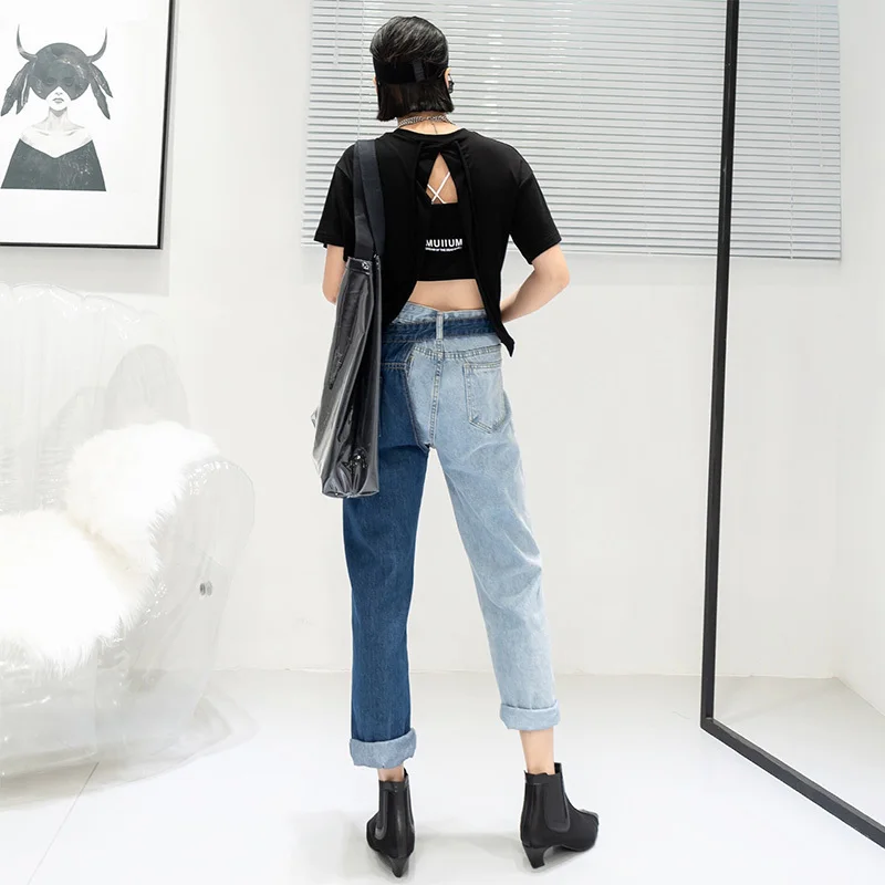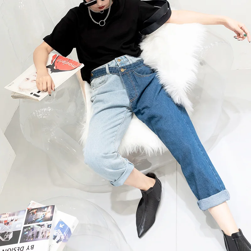 Special Offer [EAM] nueva primavera 2019 moda alta cintura Patchwork Hit Color desmontable azul Jeans pantalones vaqueros rectos Mujer SC08 Discount 20% Today!