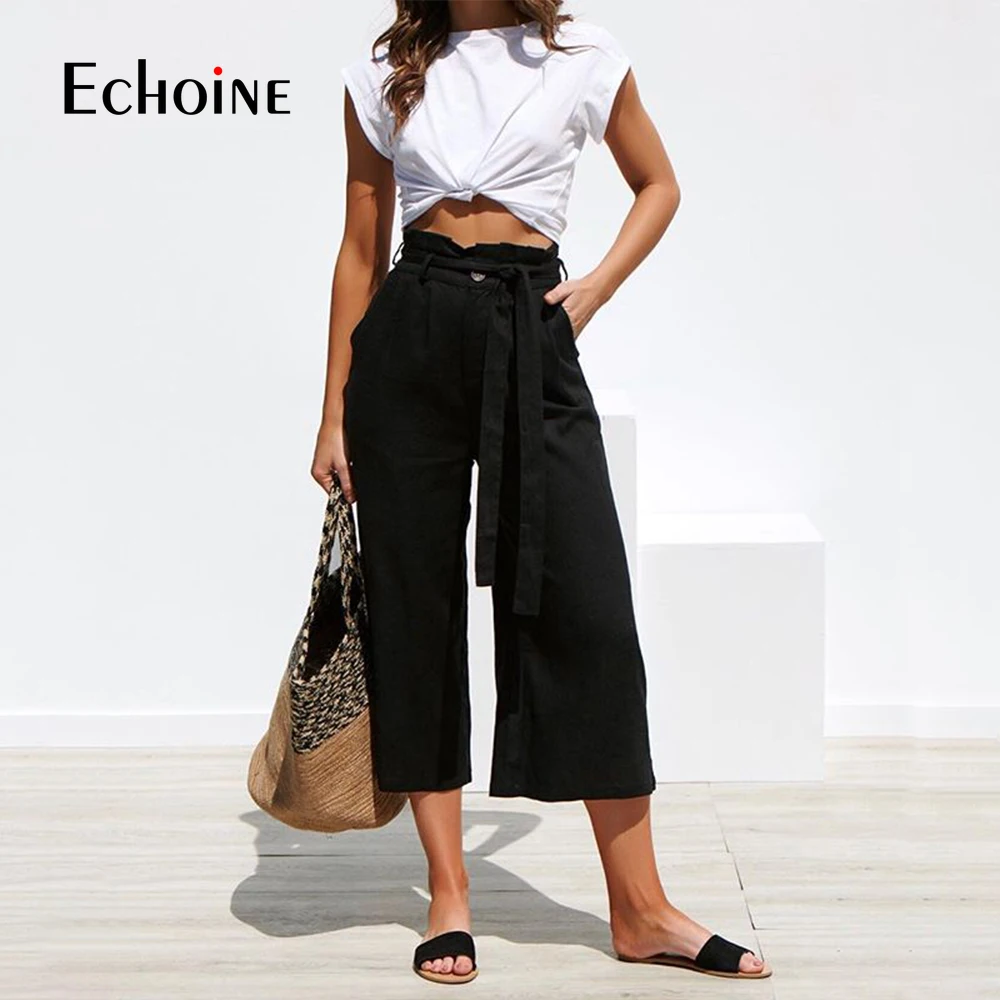 . (36% Off) Comprar Casual algodón Lino mujeres de alta cintura pierna ancha pantalones verano otoño Oficina banda suelta palazzo pantalones femeninos negro amarillo Pantalones Online Baratos.