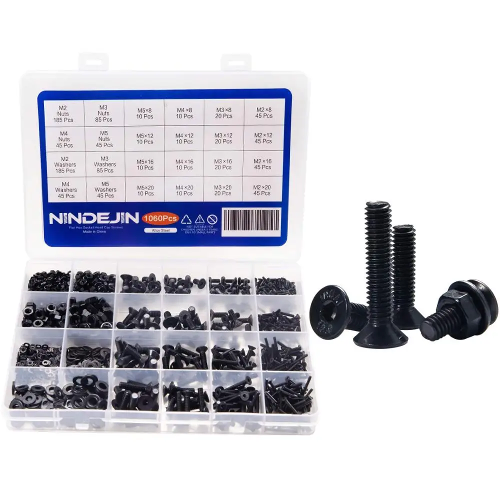 Special Offer NINDEJIN 1060 unids set M2 M3 M4 M5 tornillo hexagonal Tornillos de acero de carbono tornillos y tuercas arandelas Kit surtido con caja de almacenamiento Discount 40% Today!