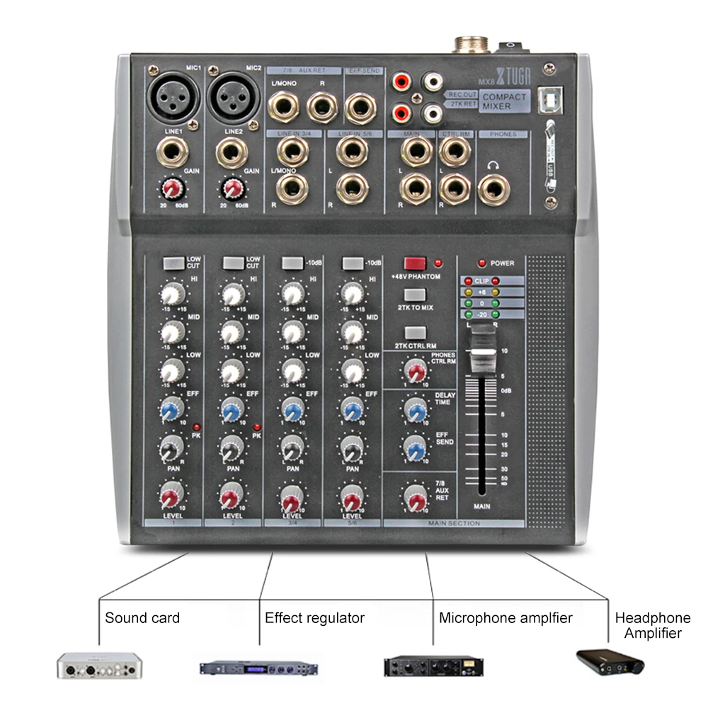 . (0% Off) Comprar XTUGA MX8 8 canales, 3 banda EQ de Audio de música mezclador consola de mezcla con USB XLR Line de entrada de alimentación Phantom de 48V para la grabación de DJ etapa Online Baratos.
