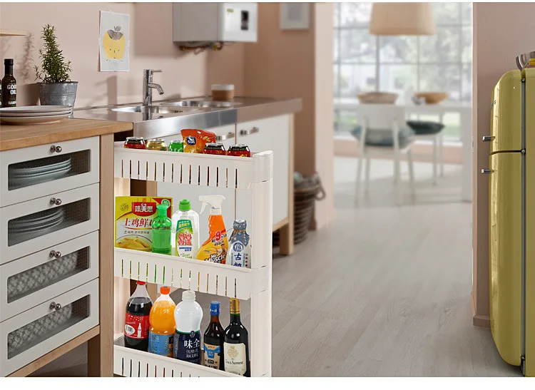 . (16% Off) Comprar Estante de almacenamiento de cocina de 3 niveles estante de deslizamiento Delgado torre de montaje móvil de plástico estante de baño ruedas organizador de ahorro de espacio Online Baratos.