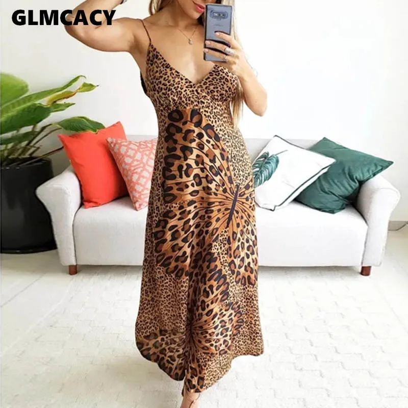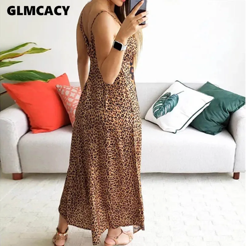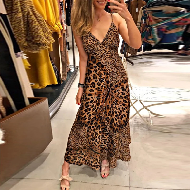 Special Offer Mujeres Sexy cuello pico leopardo Spaghetti Strap A line vestido verano Casual estampado delgado sin mangas tobillo longitud vestido noche Club vestido Discount 40% Today!