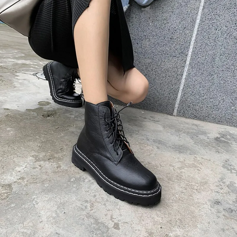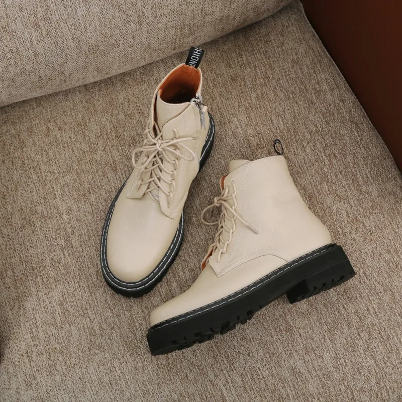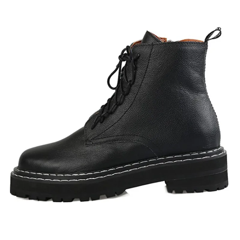 Special Offer Botas con cremallera de cuero genuino para Mujer botas gruesas para motocicleta botas para Mujer Otoño Invierno botas de combate con cordones de punta redonda Discount 45% Today!
