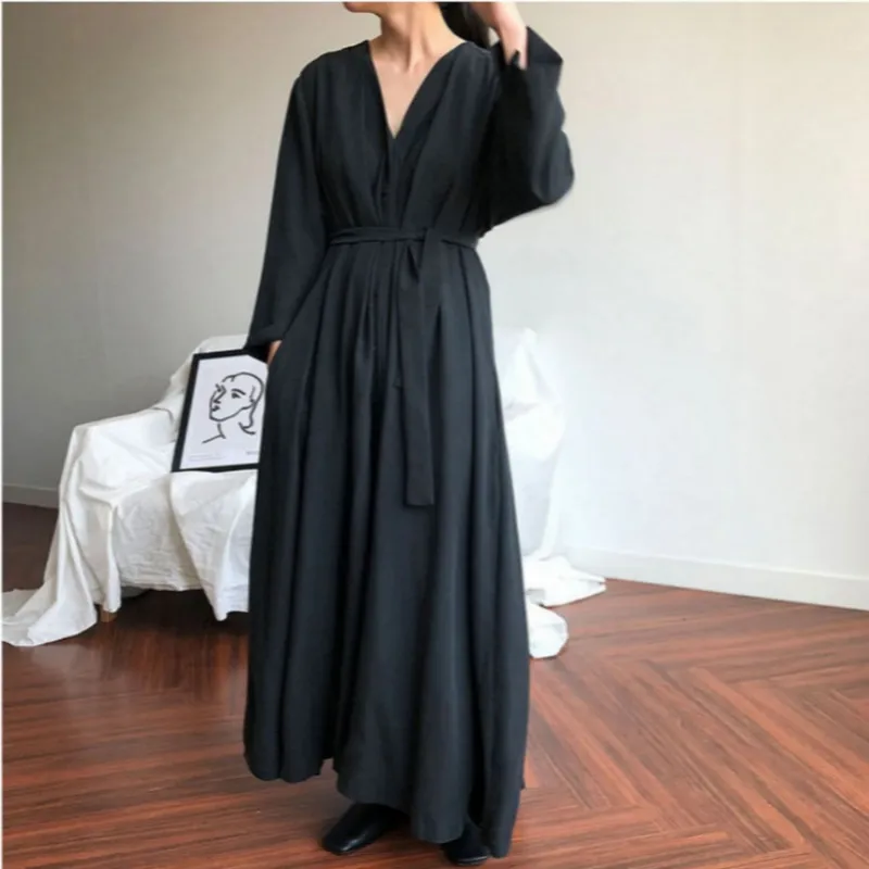 Special Offer Vestido camisero largo de otoño para mujer Sexy con cuello en V de manga larga de gasa vintage maxi vestidos con cintura alta breve color sólido Discount 12% Today!