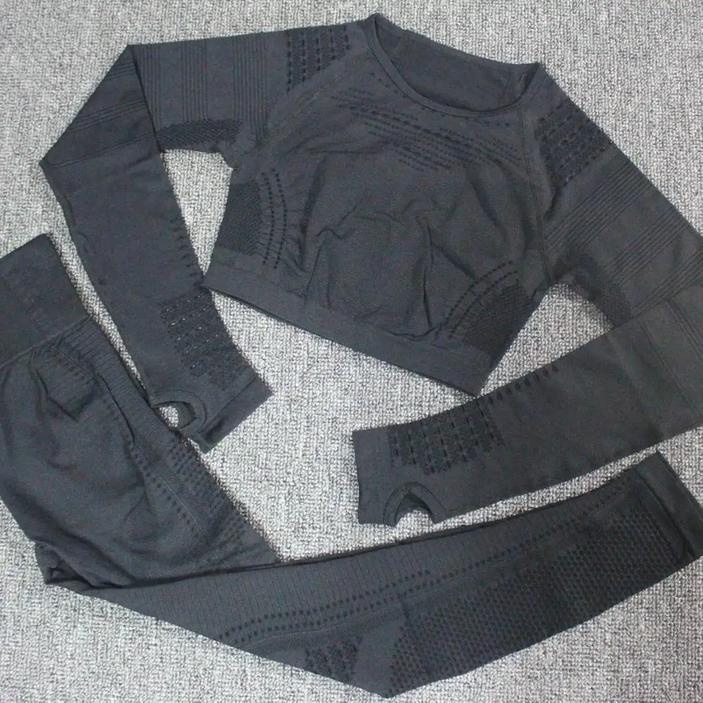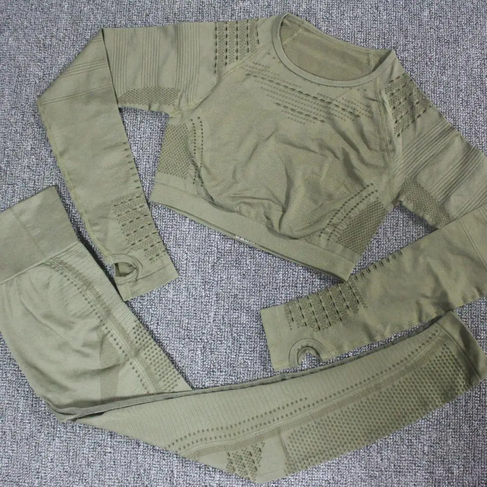 Special Offer Conjunto de 2 piezas de Yoga para mujer ropa de entrenamiento de punto impecable de manga larga de compresión de malla hueca + sin costuras polainas de Yoga gimnasio Discount 40% Today!