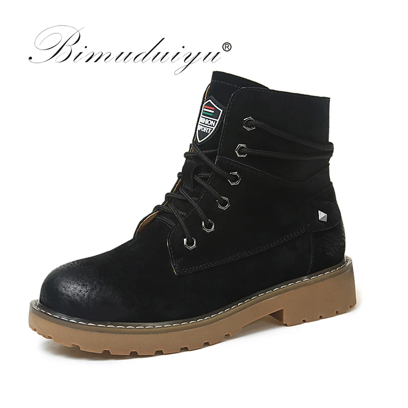 Special Offer BIMUDUIYU marca Otoño Invierno cuero genuino cerdo gamuza botines alta calidad limpiar Color moda botas de mujer nuevas botas de nieve Discount 60% Today!
